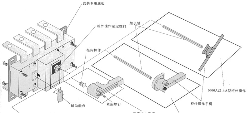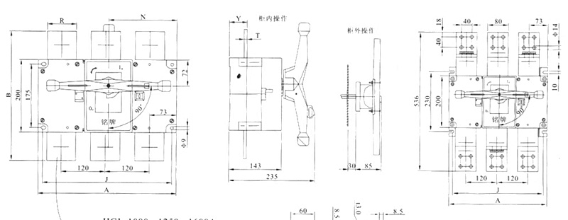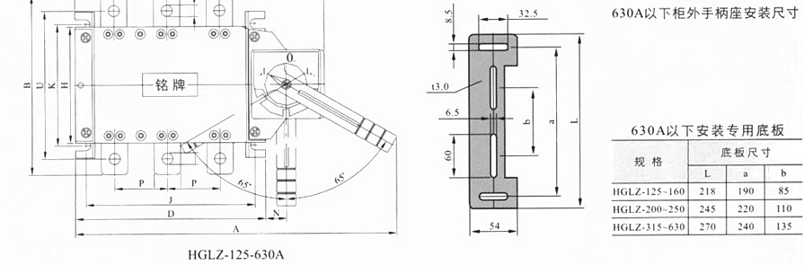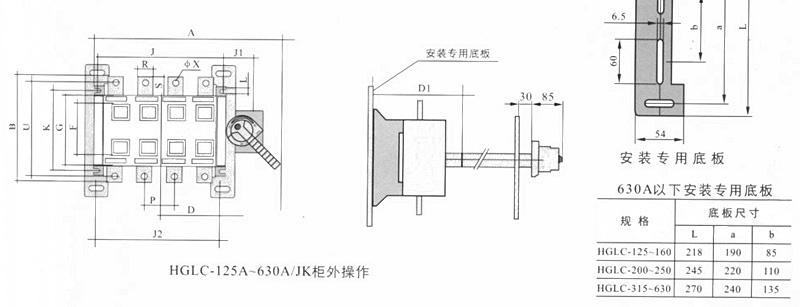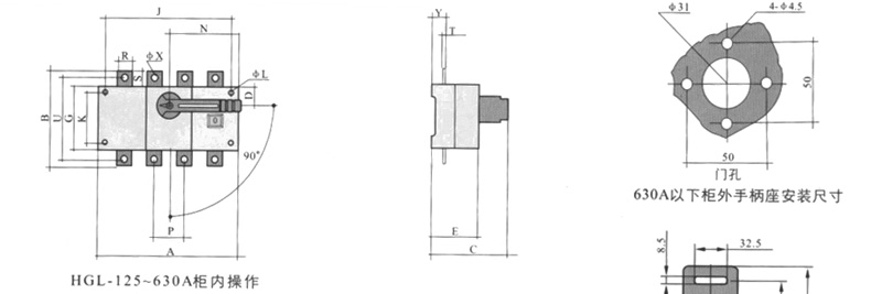 侧面操作负荷隔离开关 HGLC-125~1600A适用于电路的接通与分断或电气隔离。有三极、四极(三极+可通断中性极) 可根据需要提供有观察窗口的产品,直接观察触头的通断状态。 柜内操作:手柄安装在开关右侧。 柜外操作:手柄安装在配电柜柜门外。 根据需要可配装两组辅助触点。 加长轴用于柜外操作。 电气性能与机械性能和HGL-125~1600A电气性能与机械性能相对应。 ![]() HGL-125A~630A负荷隔离开关