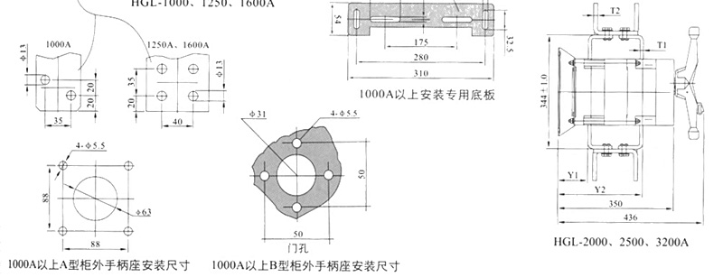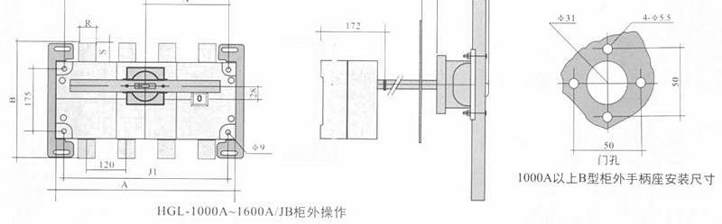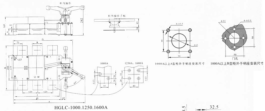 HGL-125A~1600A负荷隔离开关 转换负荷隔离开关 HGLZ-125~1600A适用于两条低压电路切换或者两个负载设备的转换或安全隔离等。 柜内操作:手柄直接安装在开关上。 柜外操作:手柄安装在配电柜柜门外。 可根据需要提供有观察窗口的产品,直接观察触头通断状态。 有三极、四极(三极+可通断中性极)。 加长轴用于柜外操作 根据需要可配装两组辅助触点。 电气性能与机械性能和HGL-125~1600A电气性能与机械性能相对应。 可提供桥式连接导体接通开关的进线端或出线端。 注:1000A以上开关分为上下和左右排列两种形式,订货时说明。