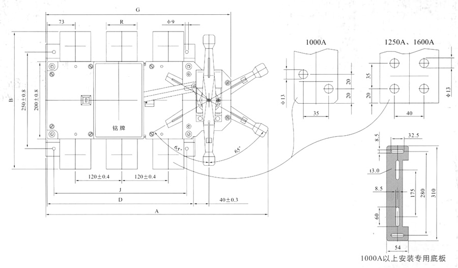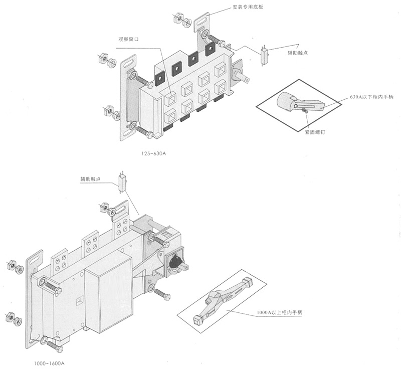柜后操作负荷隔离开关 125A-630A适用于电路的接通与分断或电气隔离,1000A以上只适用于电气隔离。125A-630A有三极、四极(三极+可通断中性极)。 630A以下可根据需要提供有观察窗口的产品,直接观察触头的通断状态。 可根据需要配装两组辅助触点。 电气性能与机械性能和HGL-125A~1600A电气性能与机械性能相对应。 注:仅提供柜外操作产品。 ![]()